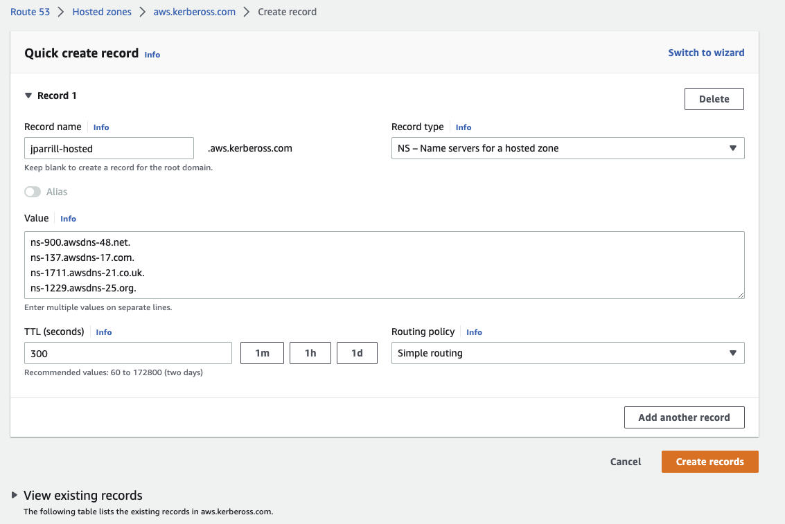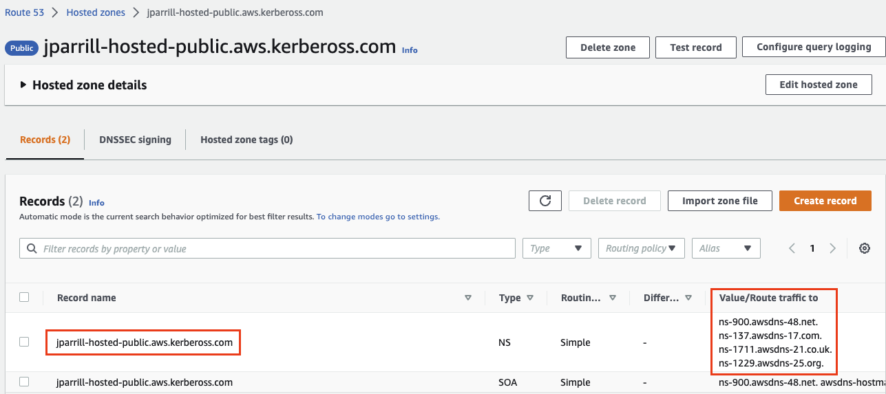 - In the main domain, create the NS record to redirect the DNS requests to that delegated zone (use the values from the previous step)