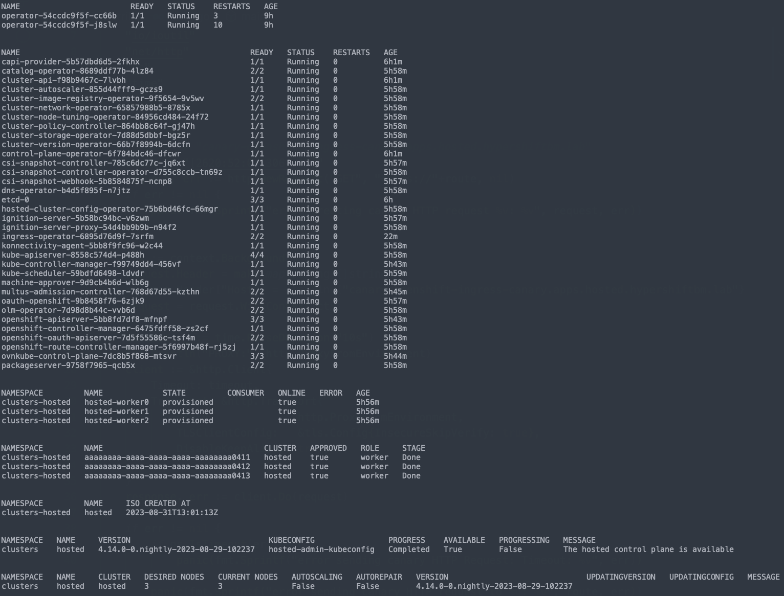 watch "oc get pod -n hypershift;echo;echo;oc get pod -n clusters-hosted-ipv4;echo;echo;oc get bmh -A;echo;echo;oc get agent -A;echo;echo;oc get infraenv -A;echo;echo;oc get hostedcluster -A;echo;echo;oc get nodepool -A;echo;echo;"